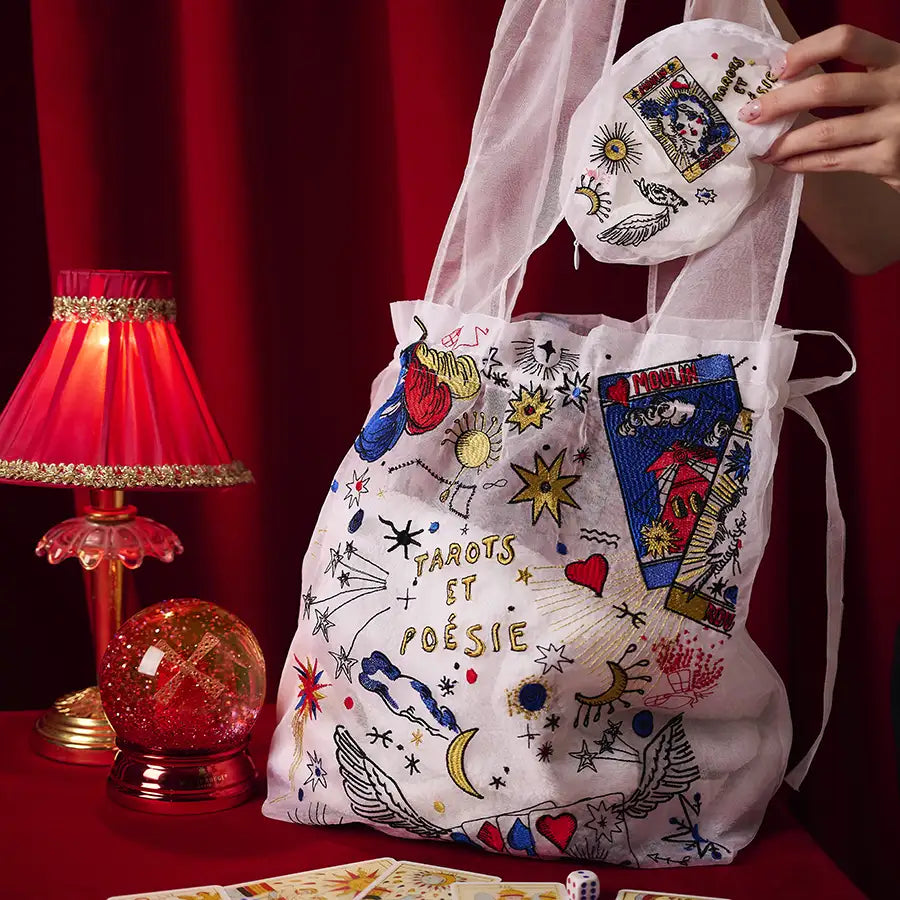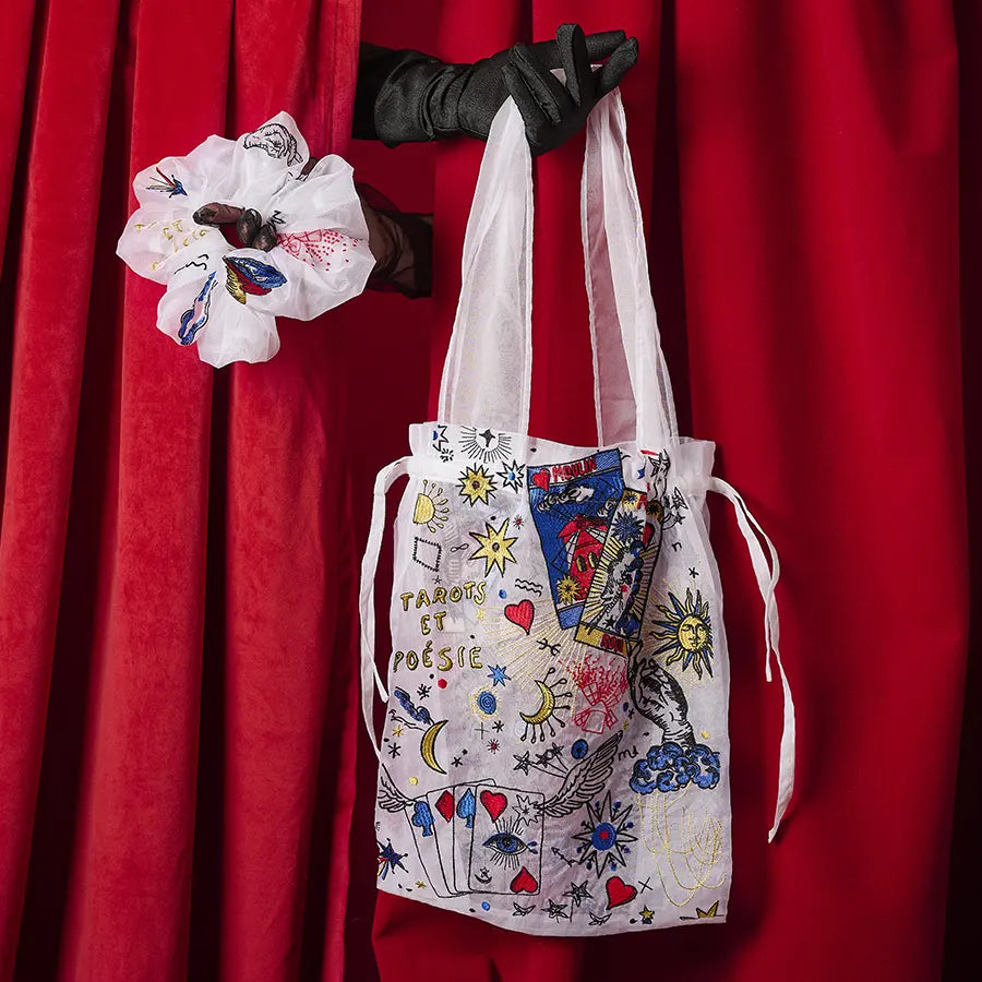 Moulin Rouge® x Brigitte Tanaka: Découvrez le sac Divination 100% organza. Entièrement brodé et modulable grâce à ses cordons, il vous accompagne quotidiennement avec élégance, abritant secrets et trésors. Ses broderies, inspirées du décor “Tarots et Poésie” de la salle du Moulin Rouge, mêlent mystère et éclat dans une danse délicate entre rêve et lumière.