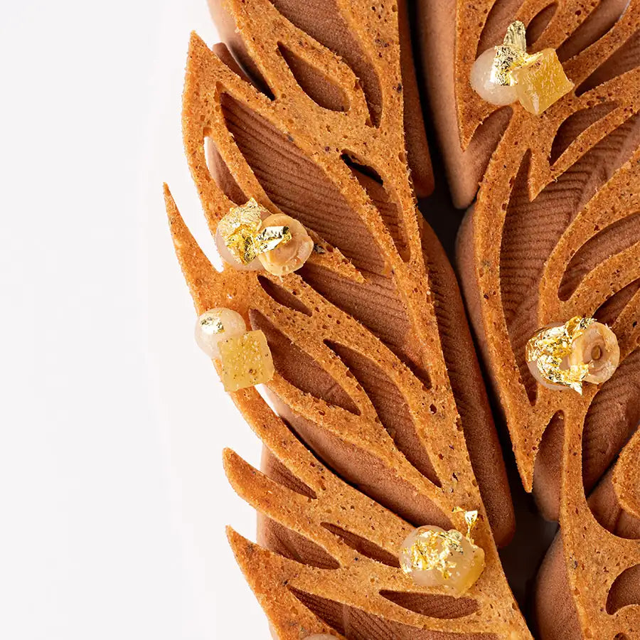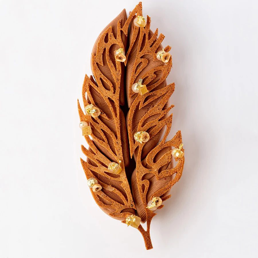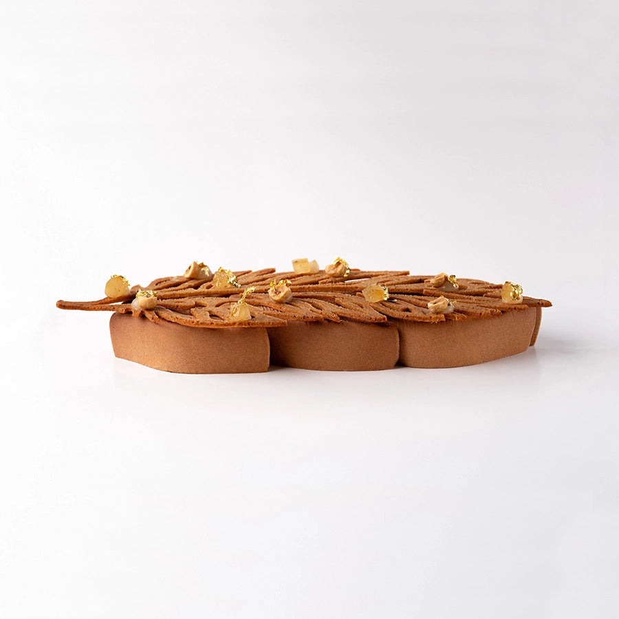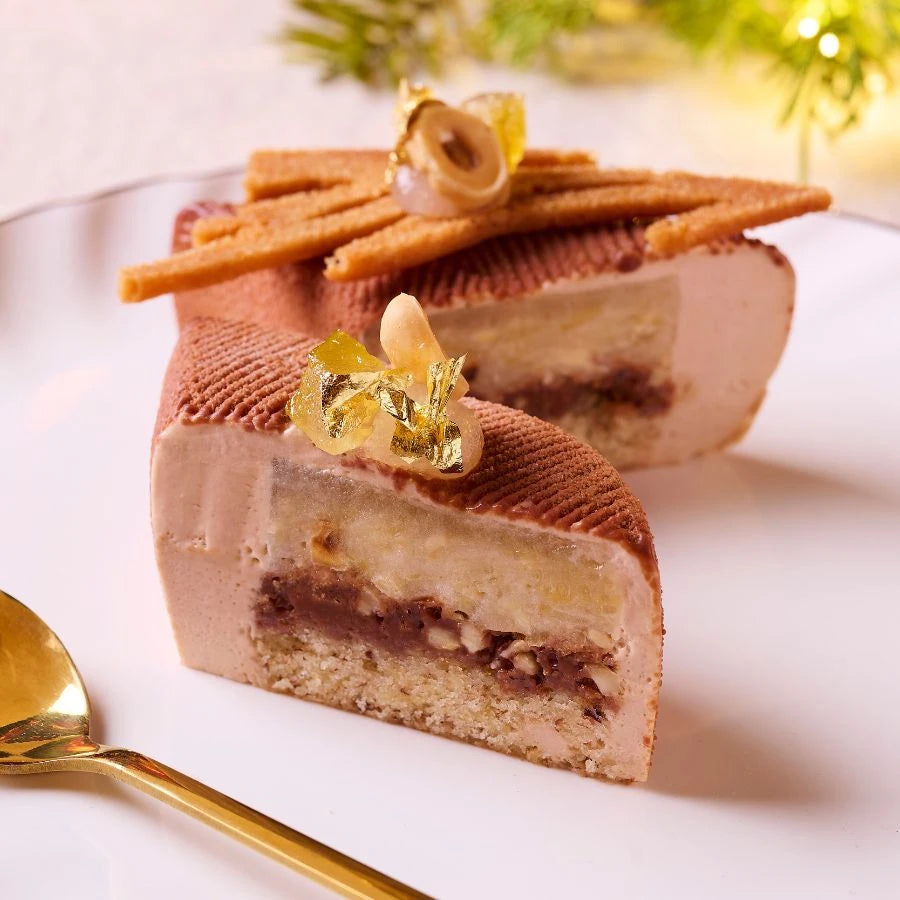 Gianduja Piedmont hazelnuts & Menton lemons: an ode to elegance and indulgence. Creamy gianduja with Piedmont hazelnuts is combined with the tangy freshness of Menton lemon, a rare and precious fruit from the Riviera. Delicate biscuit, crunchy praline, and melt-in-the-mouth mousse intertwine in a refined creation, where the generosity of chocolate meets the bright sparkle of citrus. A subtle composition that celebrates the alliance of tradition and modernity.